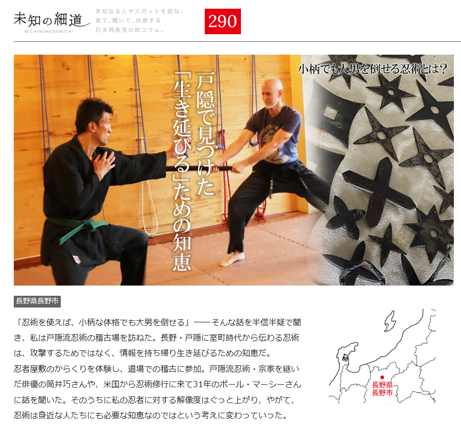 実は世界で最もよく知られる忍術という”戸隠流忍術”について取材しました。長野県戸隠まで 戸隠流忍法資料館を訪ね、 戸隠流忍術の35代宗家を継ぎ「世界忍者戦ジライヤ」でも有名な俳優の筒井巧さん、 31年間、忍術の修行を続けるポール・マーシーさんにお話し聞き、楽しい取材時間でした。